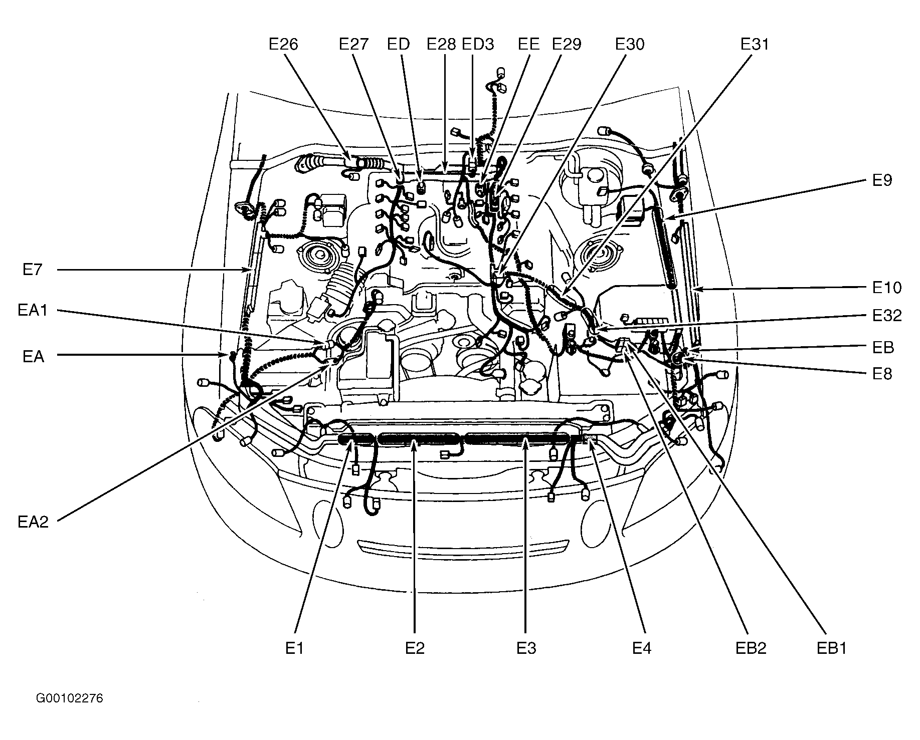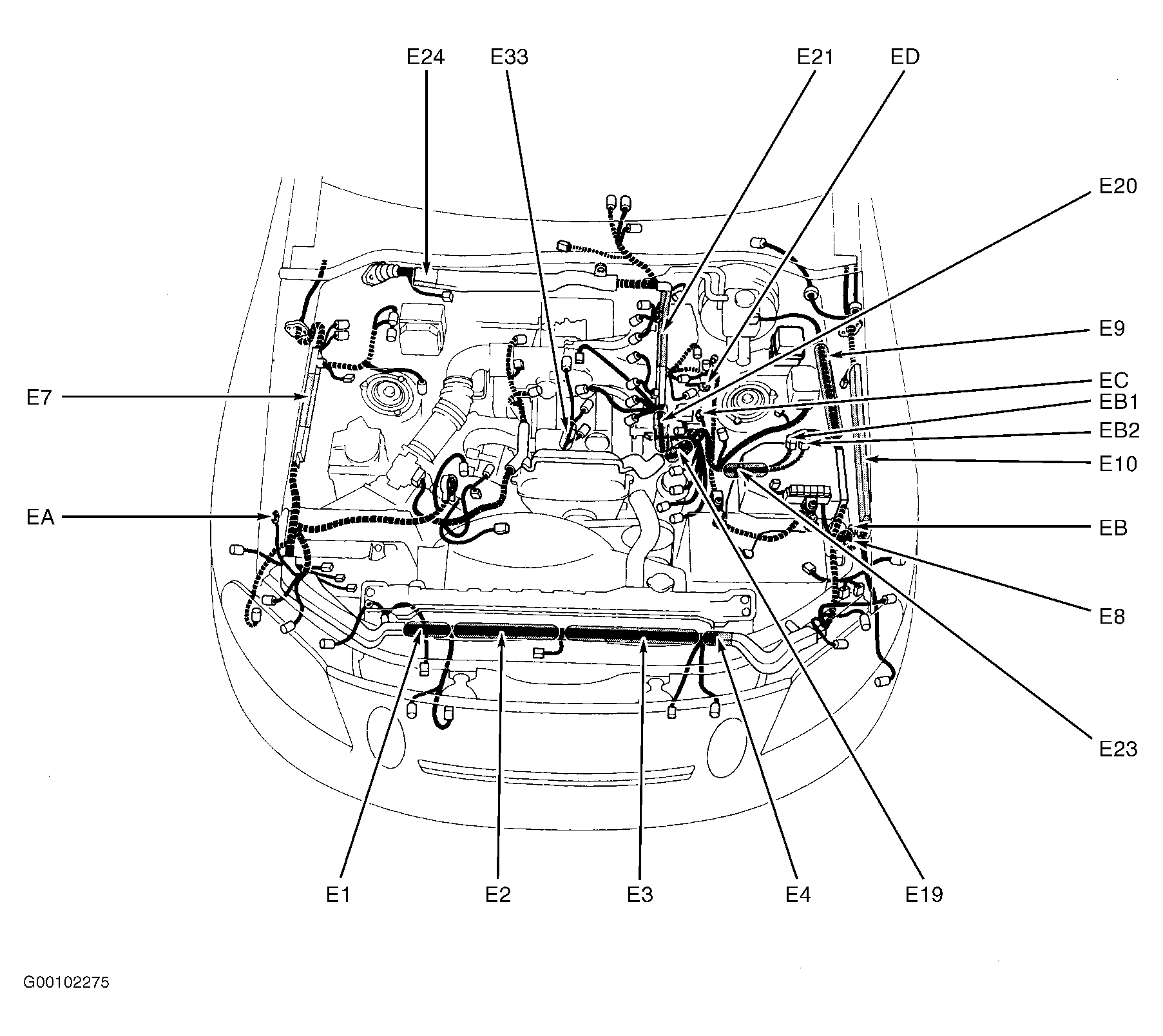 E2 (SC400) In engine harness, at upper right radiator support. See Figure.