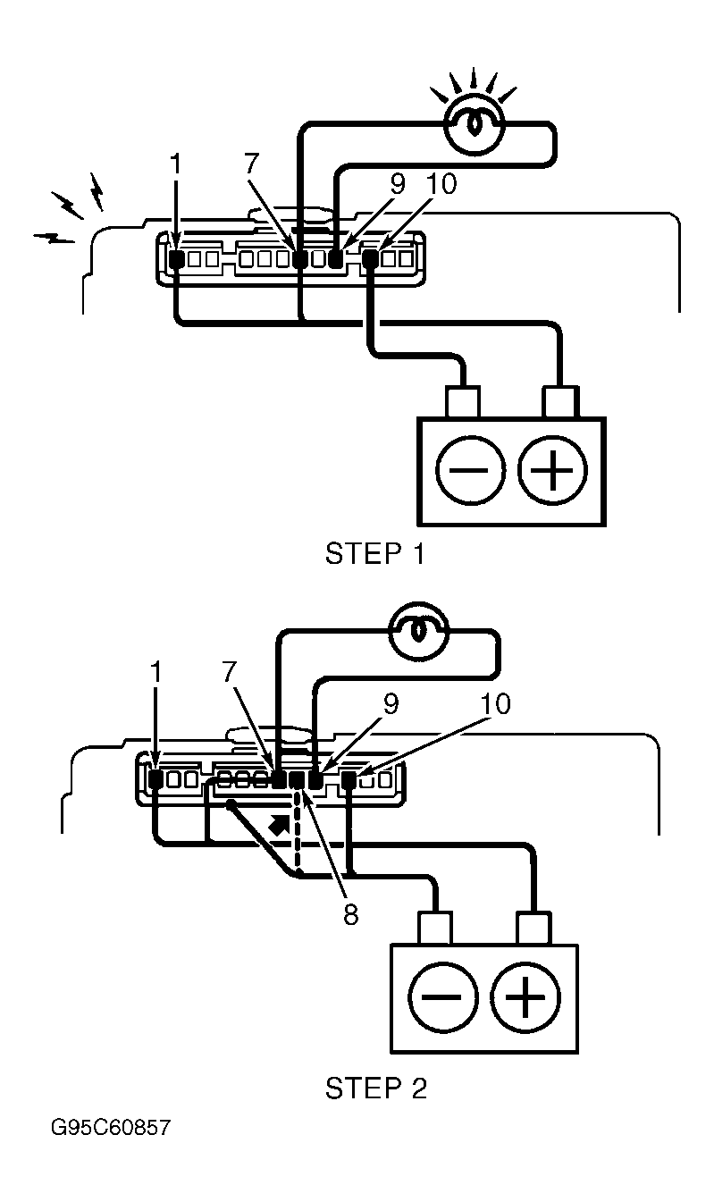 - Disconnect 12-pin relay connector. Connect positive lead from battery to relay terminals No. 1 and 7. Connect 3.4-watt bulb between terminals No. 7 and 9. Connect negative lead from battery to terminal No. 10. Perform STEP 1. See Fig 1. Bulb should light and buzzer should sound for 4-8 seconds.