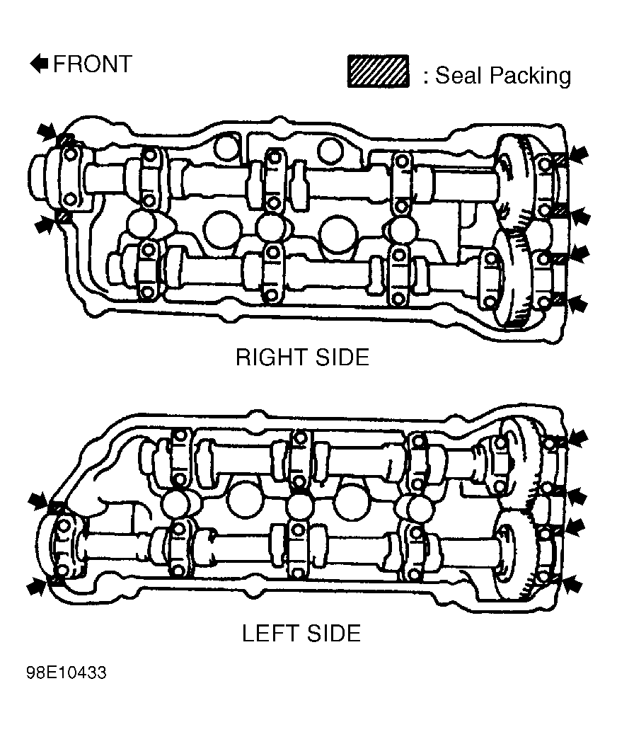 - To install remaining components, reverse removal procedure. Use NEW gaskets at air intake chamber and EGR pipe. Remove old valve cover seal packing material. Install NEW Seal Packing (08826-00080) material. See Fig 4. Use NEW gaskets as necessary. Refill cooling system. Tighten nuts and bolts to specification. See TORQUE SPECIFICATIONS .