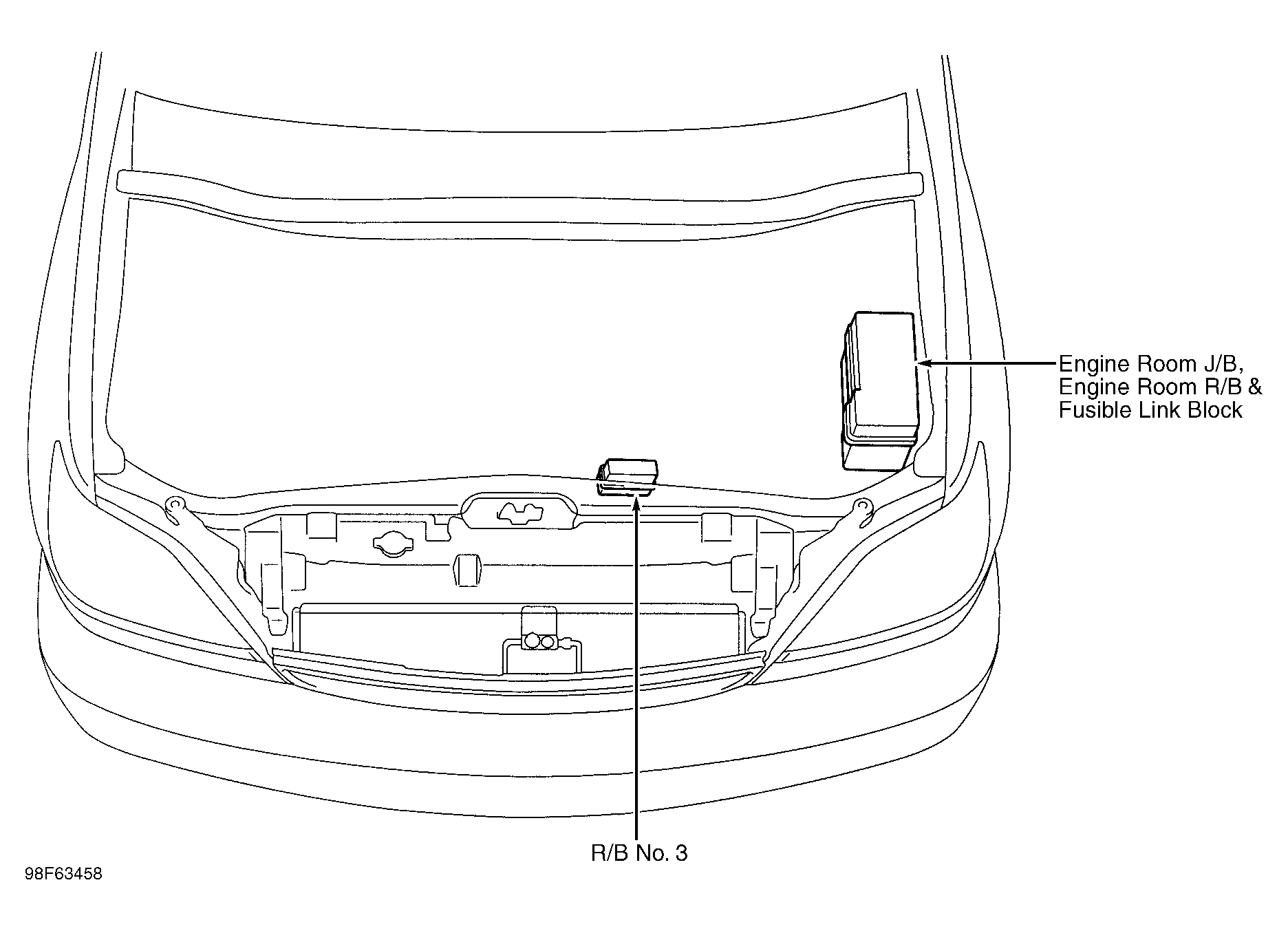 | R/B No. 3 | On front center of engine compartment, on radiator support. See Figure. |