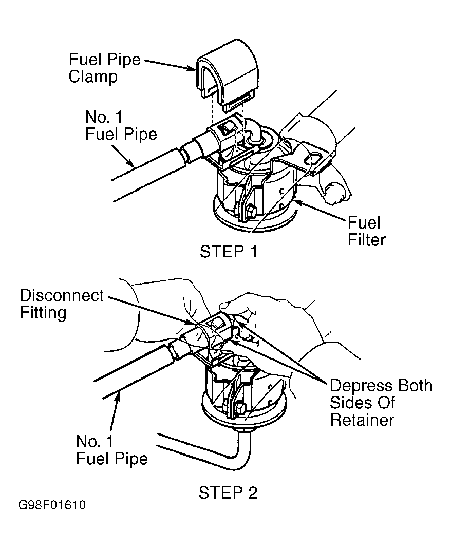 FUEL SYSTEM under REMOVAL, OVERHAUL & INSTALLATION article. Fuel injector is connected to fuel filter for checking fuel injector volume. Remove fuel pipe clamp from No. 1 fuel pipe at fuel filter. Perform STEP 1. See Fig 1. Ensure area around No. 1 fuel pipe and fuel filter is clean. Depress both sides of retainer and pull No. 1 fuel pipe with disconnect fitting from fuel filter. Perform STEP 2. See Fig 1.