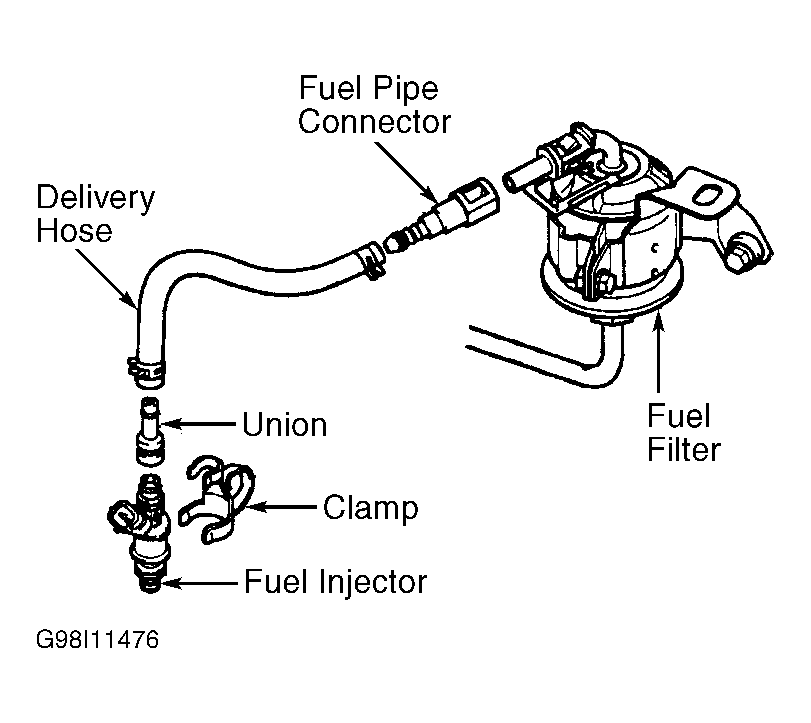 - Install delivery hose from Fuel Injector Measuring Kit (SST 09268-41047) with fuel pipe connector on fuel filter. See Fig 2. Ensure delivery hose and fuel pipe connector are properly connected on fuel filter. Check that grommet and "O" ring are installed on top of fuel injector. Using clamp and union from fuel injector measuring kit, connect fuel injector to delivery hose. See Fig 2.