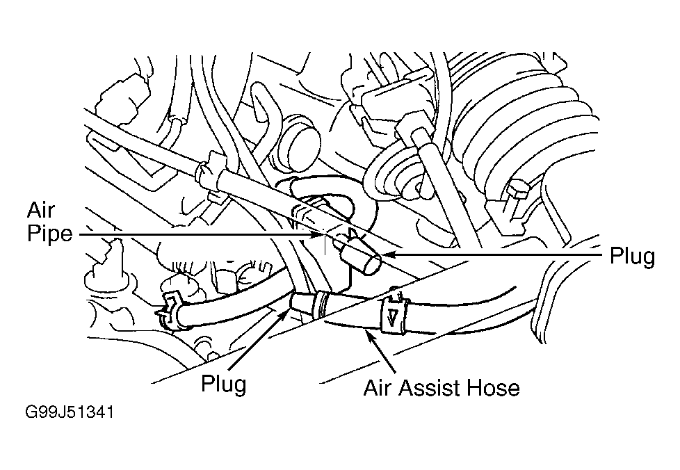 - On all models, engine speed should increase to about 900-1300 RPM for about 10 seconds then return to idle (650-750 RPM). Turn ignition off. Disconnect air assist hose from air pipe. See Fig 1. Plug hose end, and cap off hose pipe fitting.