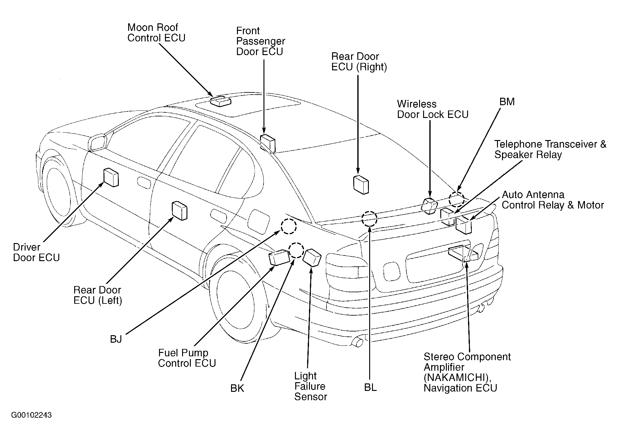 | Navigation ECU | At right rear corner of luggage compartment. See Figure. |