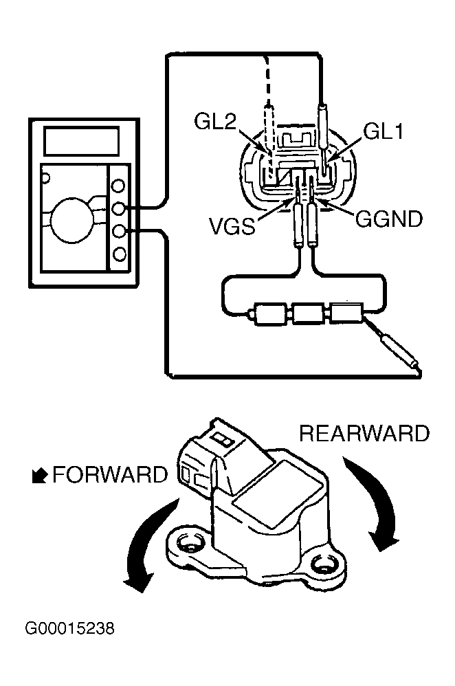 Locate deceleration sensor under center console, rearward of shift lever. Disconnect deceleration sensor 5-pin Black connector and remove deceleration sensor. Connect 3 dry batteries of 1.5 volts in series to sensor terminals. Connect batteries positive terminal to VGS terminal. Connect batteries negative terminal to GGND terminal. Apply about 4.5 volts between terminals VGS and GGND. See Fig 1. Using a DVOM, check output voltage at terminals GL1 and GL2. See DECELERATION SENSOR VOLTAGE table.