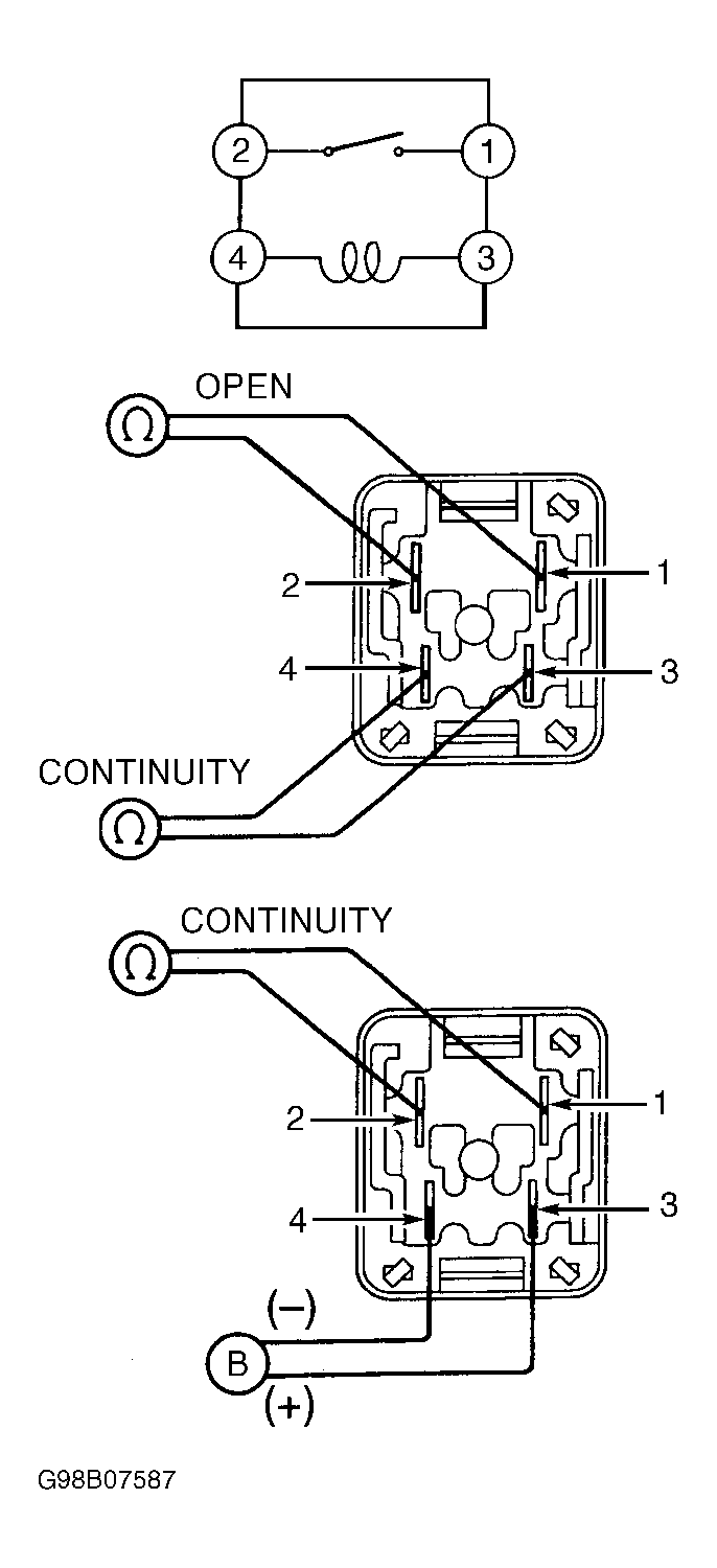 2. Using jumper wires, connect positive battery voltage to ABS motor relay terminal No. 3 and negative battery voltage to terminal No. 4. Check continuity between relay terminals No. 1 and 2. If continuity exists, replay is okay. If continuity does not exist, replace relay.