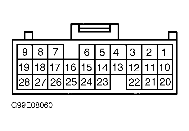 Remove instrument panel under cover, and locate ECM. See COMPONENT LOCATIONS . Using DVOM, backprobe ECM 28-pin connector E11 terminal No. 17 (Black wire). See Figure. Check for voltage with ignition in START position. If voltage is 6 volts or more, ECM is okay. If voltage is less than 6 volts, check for open in wiring harness or connectors between ECM and starter relay. Repair as necessary. If wiring harness and connectors are okay, replace ECM.