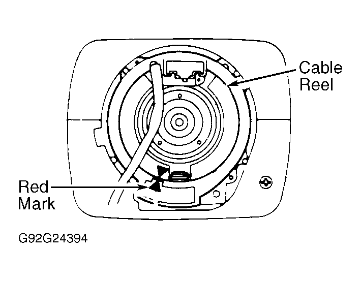 Ensure front wheels are in straight-ahead position. Rotate cable reel counterclockwise until it becomes harder to turn. Rotate cable reel clockwise 3 turns. Red mating marks should align, and Red marks should be visible through inspection hole. See Fig 1. Install steering wheel, ensuring mating marks are still aligned.