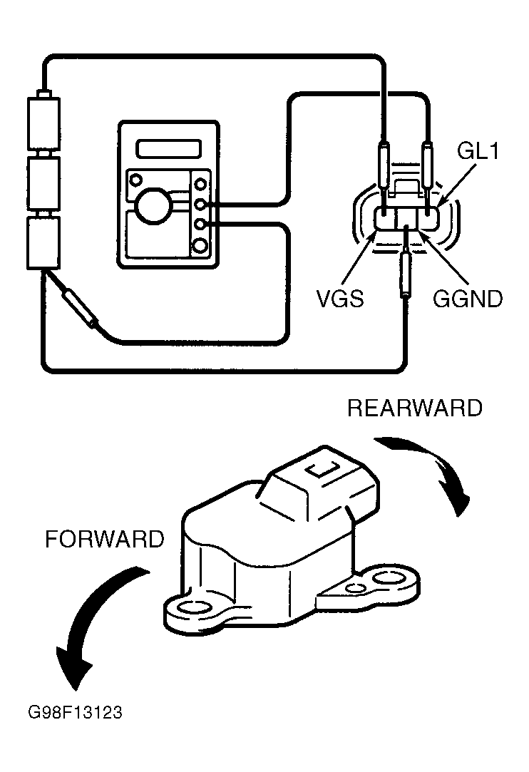 - With sensor in horizontal position, voltage reading should be about 2.3 volts. Lean sensor forward. Voltage reading should be about 0.4-2.3 volts. Lean sensor rearward. Voltage reading should be about 2.3-4.1 volts. Replace deceleration sensor as necessary.