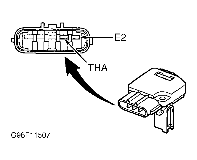 - Using ohmmeter, check resistance between terminals E2 and THA. Resistance should be within specification in relation to the temperature. See AIRFLOW METER RESISTANCE table. Replace airflow meter if resistance is not within specification.