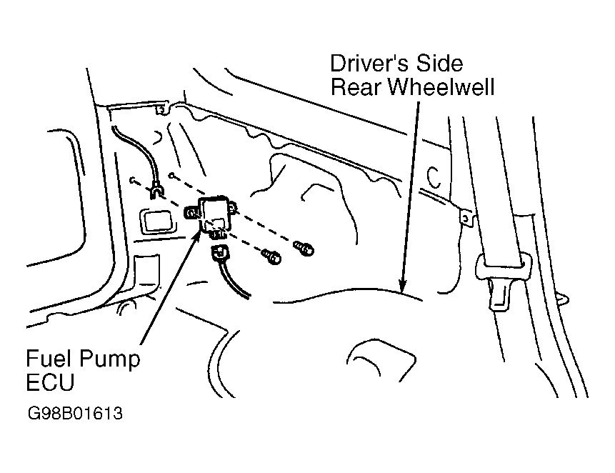 Fuel pump Electronic Control Unit (ECU) is located behind inner panel, just behind driver's side rear wheelwell. See Fig 1. Testing information is not available from manufacturer. If problem exists with fuel pump ECU or wiring circuit, a Diagnostic Trouble Code (DTC) P1200 will be stored in Engine Control Module (ECM). Retrieve DTCs and perform appropriate diagnostic test. See SELF-DIAGNOSTICS - INTRODUCTION article.