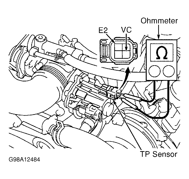 Terminal No. (Circuit) Ohms @ 68°F (20°C) 1 (M+) & 2 (M-) .3-100.0 3 (CL-) & 4 (CL+) 4.2-5.2 - To test TP sensor, disconnect electrical connector at TP sensor. See Fig 1. Using ohmmeter, check resistance between terminals VC and E2 on TP sensor. See Fig 4. Replace TP sensor if resistance is not 1250-2350 ohms at 68°F (20°C).