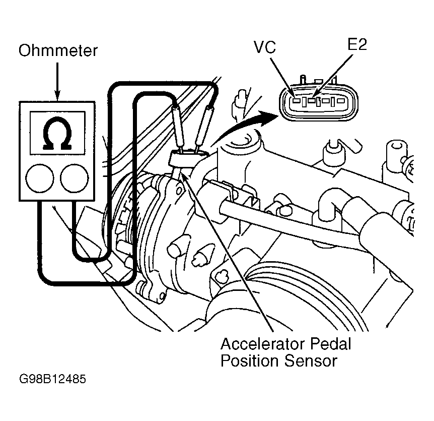 - To test accelerator pedal position sensor, disconnect electrical connector at accelerator pedal position sensor. See Fig 1. Using ohmmeter, check resistance between terminals VC and E2 on accelerator pedal position sensor. See Fig 5. Replace accelerator pedal position sensor if resistance is not 1640-3280 ohms at 68°F (20°C).