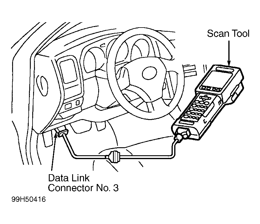 1. Remove intake manifold cover located on top of engine, above intake manifold. Start engine and warm engine to normal operating temperature. Shut engine off. Connect scan tool to data link connector No. 3. See Figure. Scan tool is used to read engine RPM.