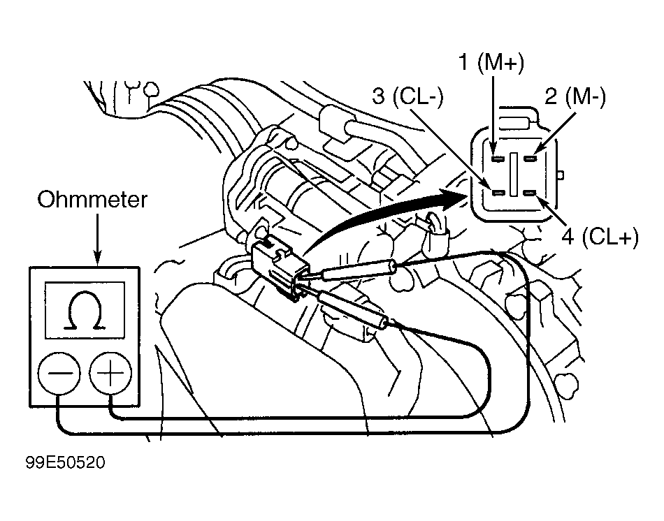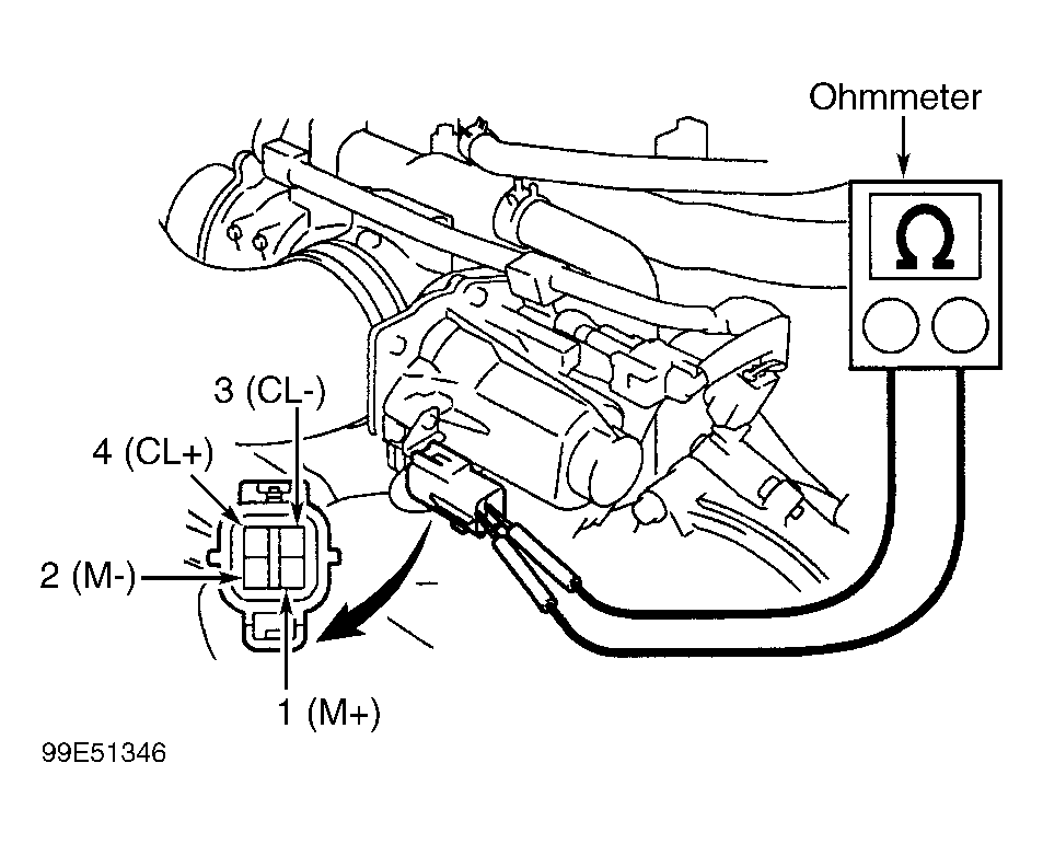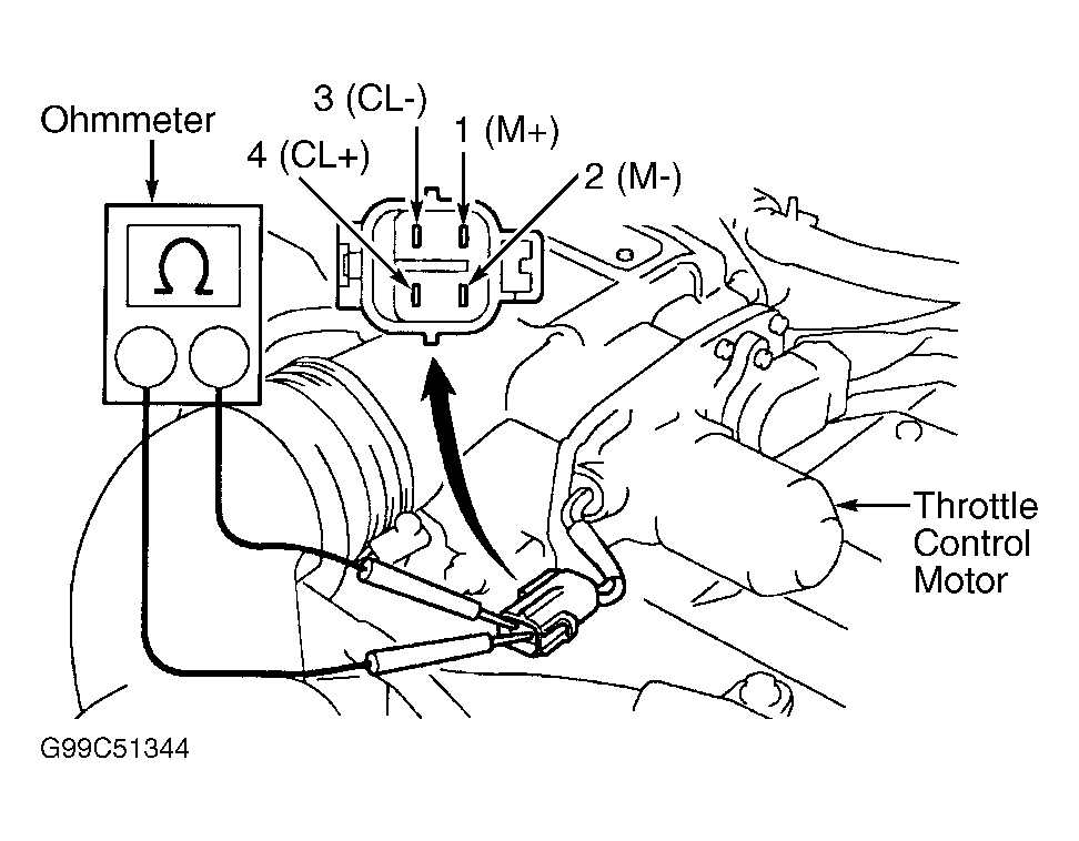- Measure resistance between terminals No. 1 (M+) and 4 (M-) at throttle control motor connector. See Fig 1, Fig 2 or Fig 3 . Resistance should be .3-100.0 ohms at 68°F (20°C). If resistance is not .3-100.0 ohms, replace throttle control motor.