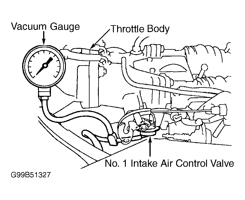 - Locate ACIS Intake Air Control Valve (IACV) to be tested. No. 1 IACV is located between the air intake chamber and No. 1 and 2 throttle bodies. See Fig 1. No 2 IACV is located on front of air intake chamber. See Fig 2. Install a 3-way vacuum "T" fitting in vacuum hose between IACV actuator and ACIS Vacuum Switch Valve (VSV). Connect a vacuum gauge to vacuum "T" fitting. Start engine. With engine idling, ensure vacuum is not present. See Fig 1 or Fig 2