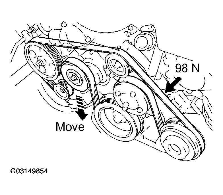 - Check that the belt tensioner moves downward when the drive belt is pressed down at the points indicated with approx. 98 N (10 kgf, 22.0 lbf) of force. See Fig 4.