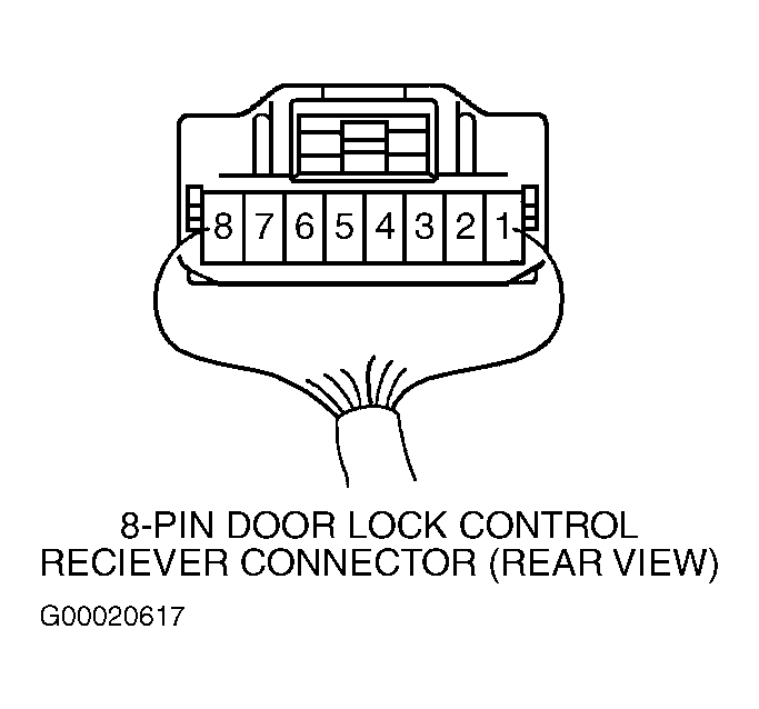 Ensure wireless door lock control receiver circuit 8-pin connector is connected. Measure voltage (backprobe) between specified terminals and ground. See Fig 1. See WIRELESS DOOR LOCK CONTROL RECEIVER CIRCUIT table. Replace wireless door lock control receiver as necessary.