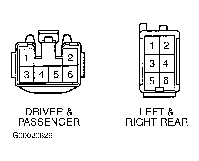 Disconnect window motor harness connector. Connect voltmeter positive lead to window motor harness connector terminal No. 3 (Yellow/Red wire) and negative voltmeter lead to terminal No. 5 (Brown/Black wire). See Figure. Apply positive battery voltage to window motor harness connector terminal No. 2 (Red wire) and connect negative battery lead to terminal No. 1 (Green wire). Pulse should be generated with window motor running. Reverse polarity of battery leads. Pulse should be generated with window motor running in opposite direction. If generated pulse is not as specified, replace window motor assembly.