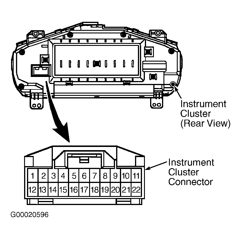 - Check combination meter 22-pin connector at circuit plate. See Figure. See INSTRUMENT CLUSTER CIRCUIT PLATE under COMPONENT TESTS. Repair as necessary. If voltages are to specification, replace instrument cluster.
