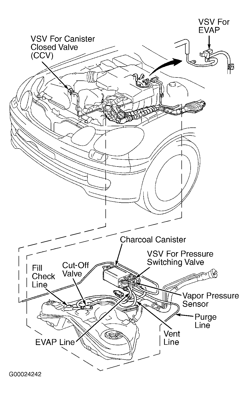 5. Locate EVAP VSV on top of engine. See Fig 3-Fig 5 . Disconnect EVAP VSV 2-pin electrical connector. Using jumper wires, connect battery voltage and ground to EVAP VSV terminals. Start engine. Go to next step.