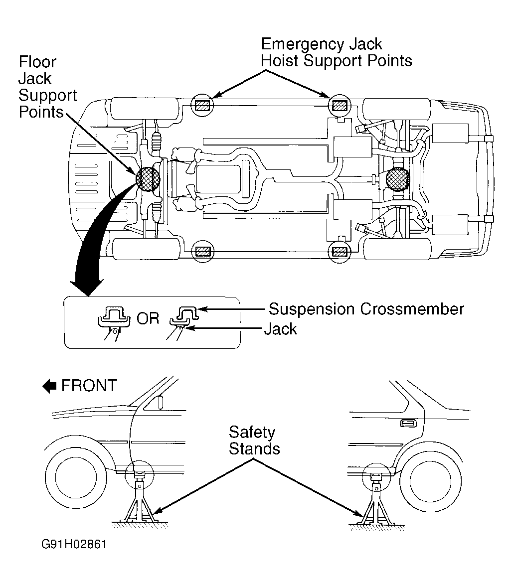Place manufacturer-supplied jack under reinforced support points of sill, between front and rear wheels. Safety stands may also be placed at these points. See Figure, Figure or Figure .
