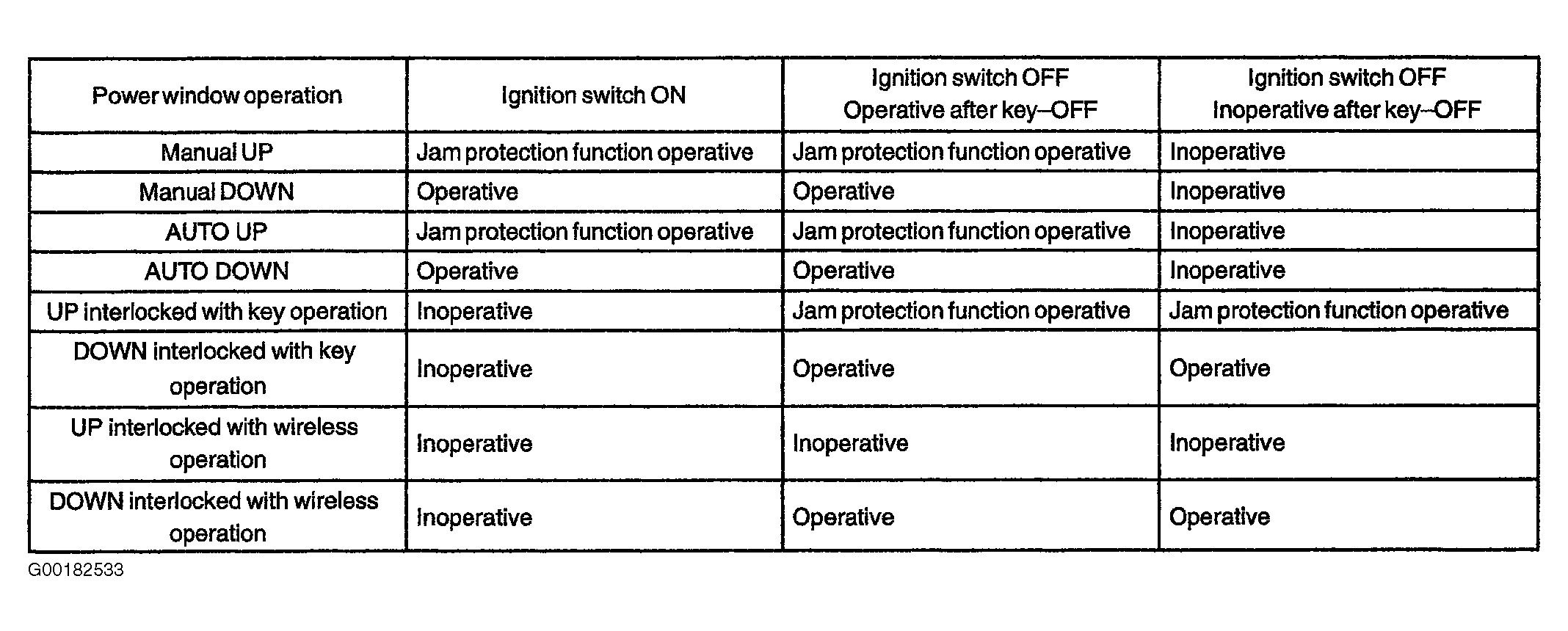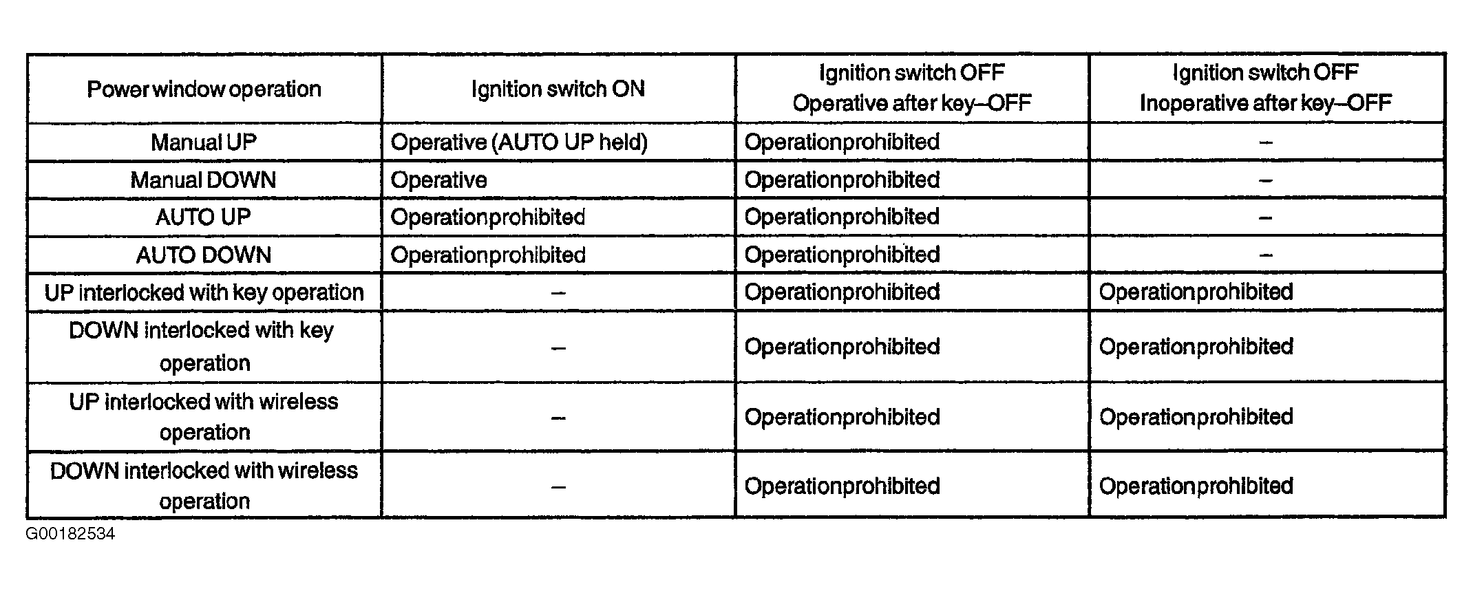 - Check the power window fail-safe function. When an abnormality is detected in the limit switch and the pulse sensor for operating the jam protection function (DTCs: B1231, B1232, B1233, B1234), the following power windows will be prohibited for fail-safe. See Fig 2. In case of the normal limit switch, prohibition (fail-safe function) will be cancelled by fully opening the door glass from fully closed by manual operation then AUTO operation will be possible.