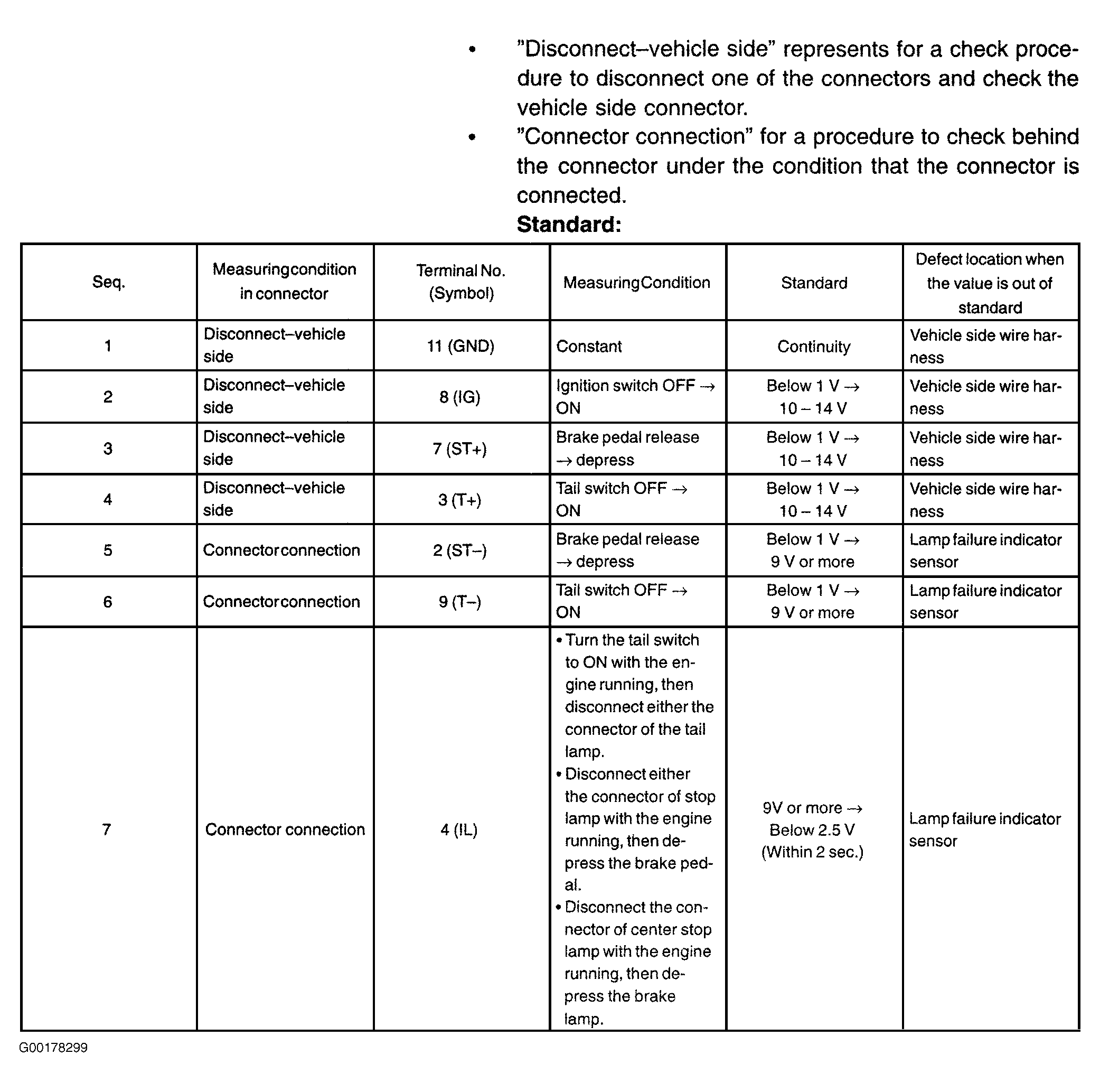 - Inspect the lamp failure indicator sensor. Check the standard signal. Check the voltage and the continuity between each terminal and body ground. For connector view, see CONNECTOR IDENTIFICATION . See Fig 1.