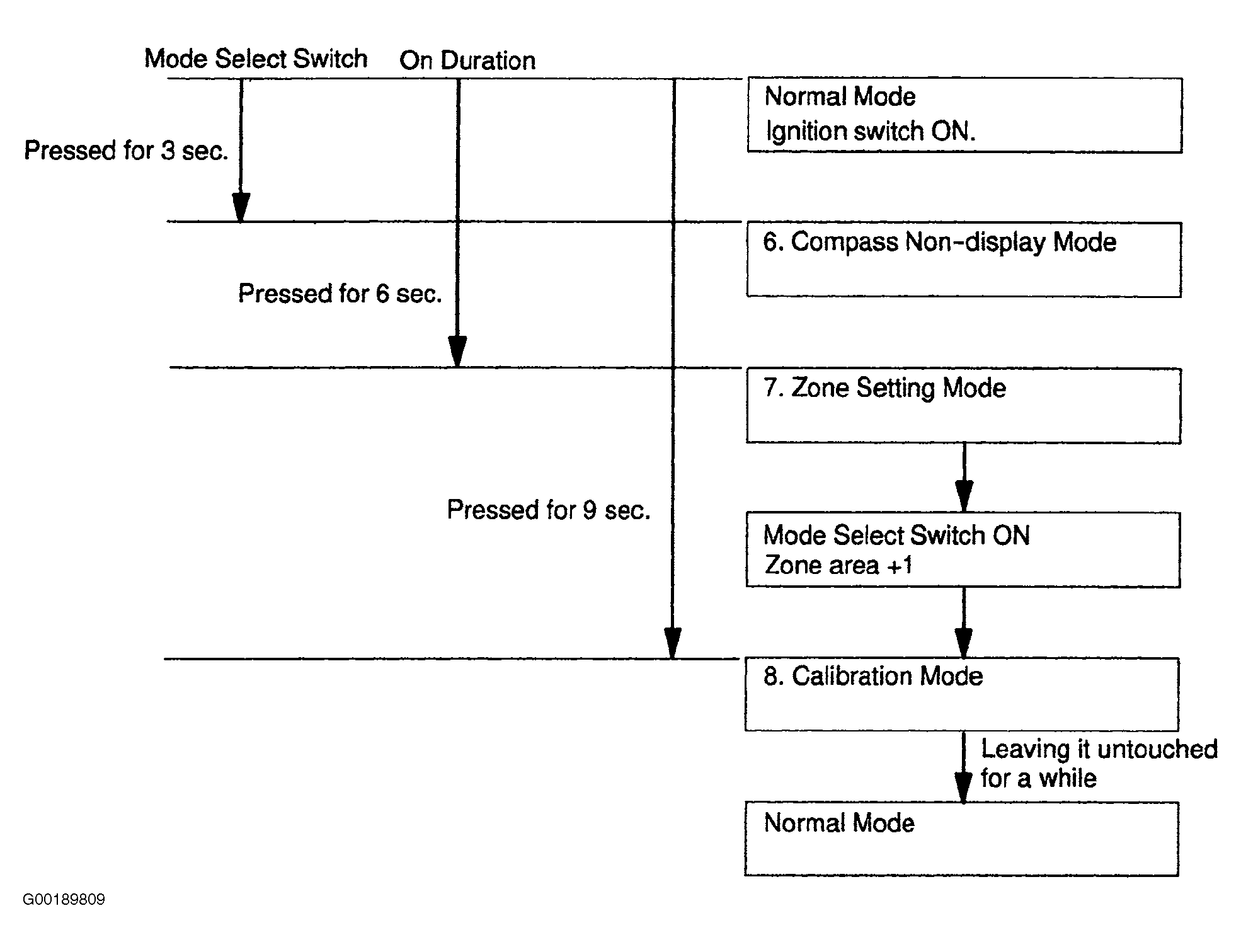 Deviation between the magnetic north and actual north differs depending on the terrestrial location, therefore, an adjustment in magnetism is required. Since the magnetic condition differs according to the area where the vehicle will be used, it is necessary for each user to set the zone. See Fig 1. The zone setting can be changed using the mode select switch of the inner mirror.