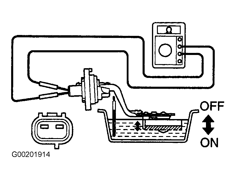 4. Check that there is no continuity between terminals with the switch OFF (float up). If the operation is not as specified, replace the switch.
