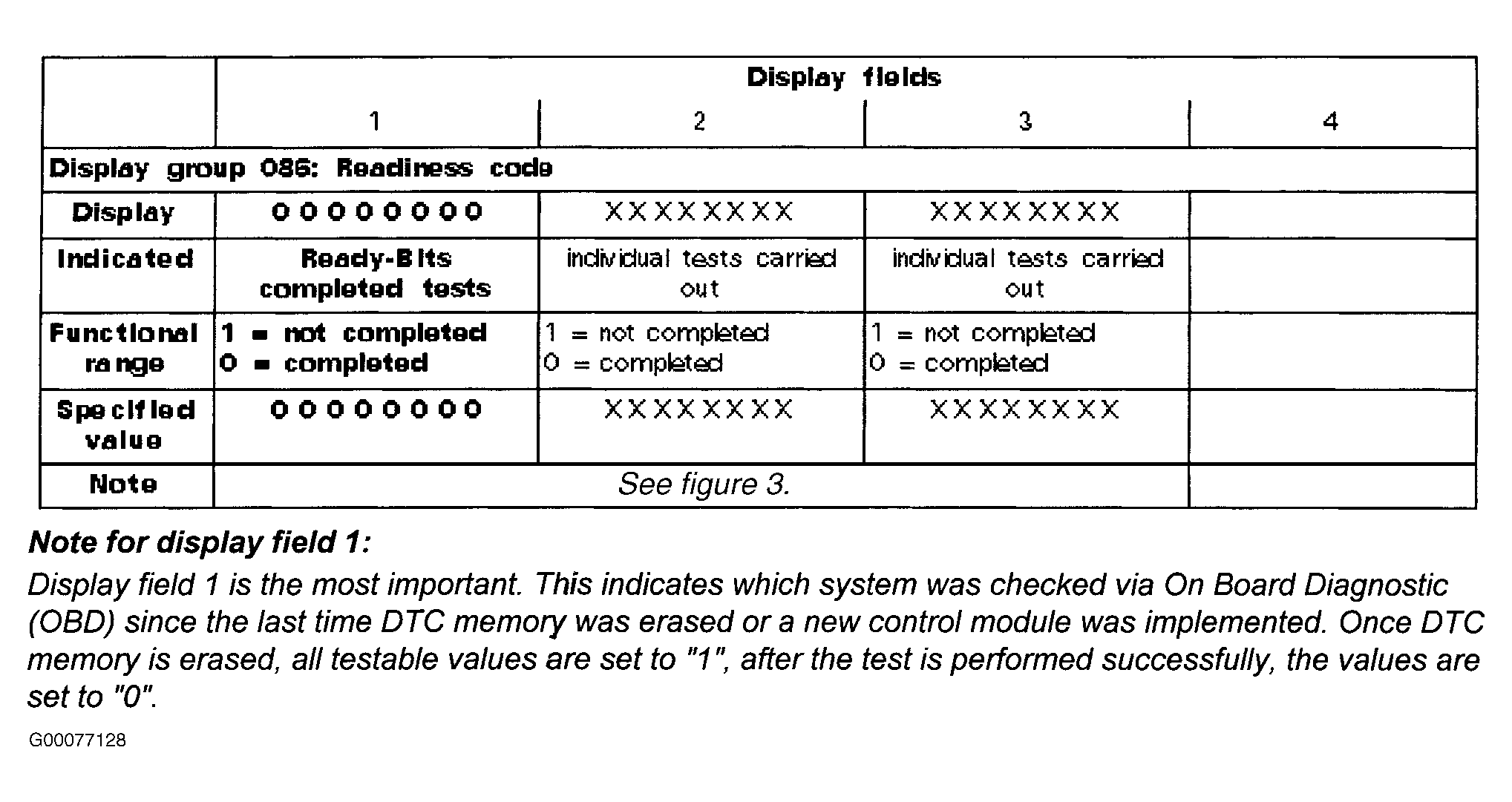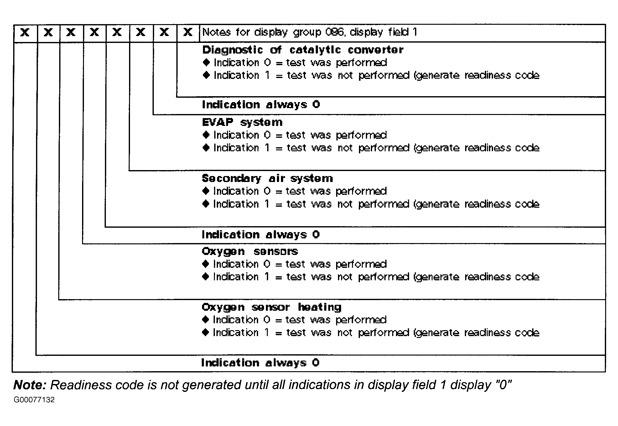 Using scan tool, retrieve DTCs. See RETRIEVING DIAGNOSTIC TROUBLE CODES in appropriate SELF DIAGNOSTICS article. If DTCs were stored, perform appropriate test. See DIAGNOSTIC TROUBLE CODE DEFINITIONS in appropriate SELF DIAGNOSTICS article. Using scan tool, clear DTC memory. See FUNCTION 05 - CLEARING DIAGNOSTIC TROUBLE CODES under SELF-DIAGNOSTIC SYSTEM in appropriate SELF DIAGNOSTICS article. After clearing DTC memory. Follow scan tool instructions to complete readiness code generation. Using scan tool, observe display field 1, in display group 086. See Figure and Figure . Readiness code should display 0 0 0 0 0 0 0 0. If readiness code displays as specified, testing is complete.