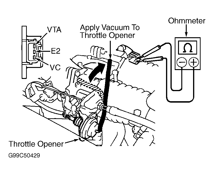 1. Disconnect electrical connector from TP sensor. Note electrical terminals on TP sensor. See Fig 1. Apply vacuum to throttle opener.
