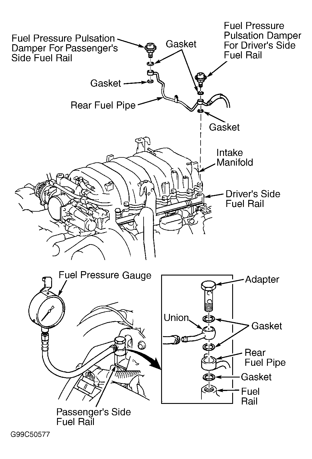 8. Release fuel pressure. Disconnect negative battery cable. Remove adapter, union and fuel pressure gauge. Using NEW gaskets, install rear fuel pipe and fuel pressure pulsation damper on passenger's side fuel rail. Tighten fuel pressure pulsation damper to 29 ft. lbs. (39 N.m). Install negative battery cable. Check for fuel leaks by using scan tool to energize fuel pump.