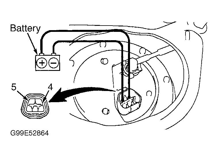 Remove rear seat cushion. Remove floor service hole cover. Disconnect 5-pin connector from fuel pump and sending unit assembly. Measure resistance between terminals No. 4 and No. 5 at 5-pin fuel pump and sending unit connector. See Figure. Replace fuel pump if resistance is not 0.2-3.0 ohms at 68°F (20°C).