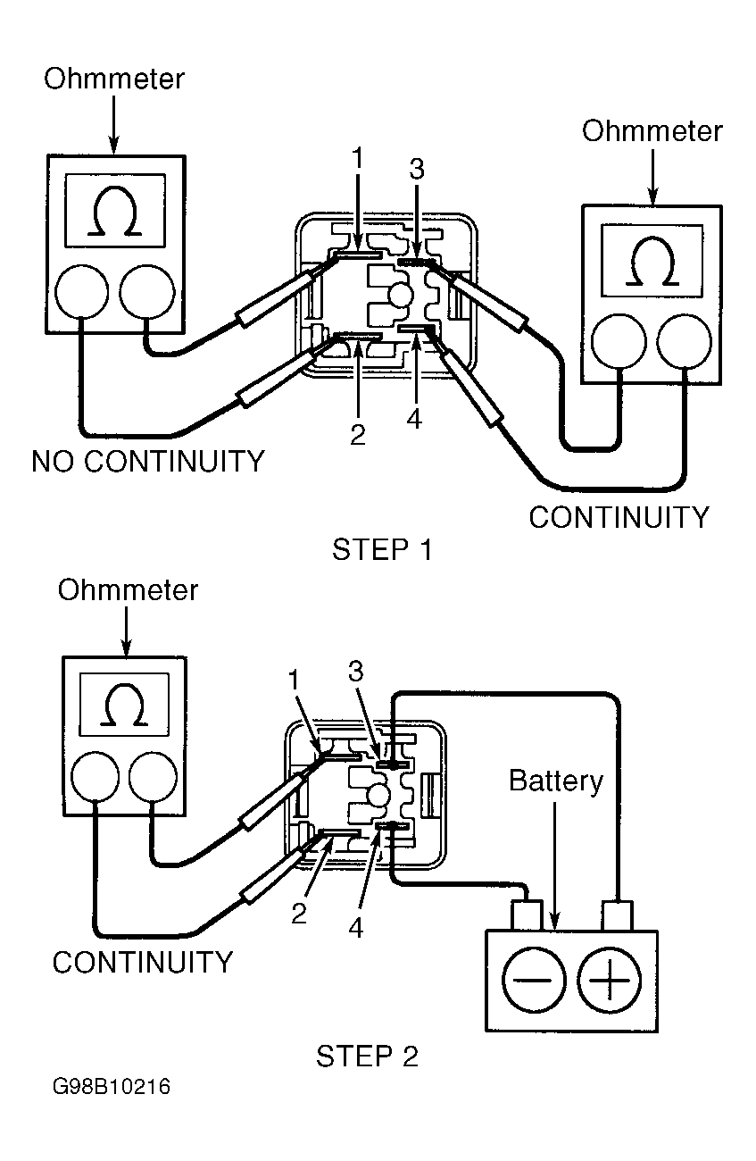 - Check relay operation by applying battery voltage to terminals No. 3 and 4. See Fig 1. See STEP 2. Continuity should now exist between terminals No. 1 and 2. If relay does not test as indicated, replace relay.