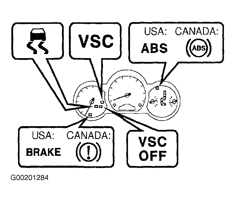 When the parking brake is applied or the level of the brake fluid is low, the BRAKE warning light is lit. If the ECU stores DTC, ABS warning light, VSC warning light and VSC indicator light are ON. See Fig 1.