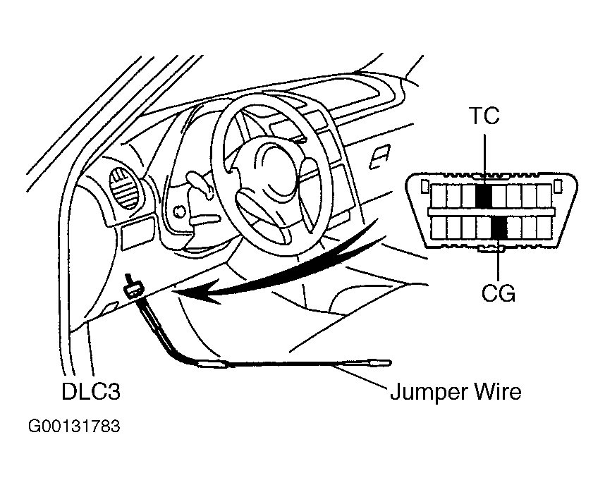 - Apply parking brake. Place transmission in Neutral. Start engine and maintain engine at 2500 RPM for 90 seconds and allow engine to idle. Ensure idle speed is 650-750 RPM. On GS300, install Jumper Wire (SST 09843-18020) between terminals TC and E1 on DLC1 located near driver's side strut tower. See Fig 3. On IS300, install Jumper Wire (SST 09843-18020) between terminals TC and CG on DLC3 located under right side of instrument panel. See Fig 4.