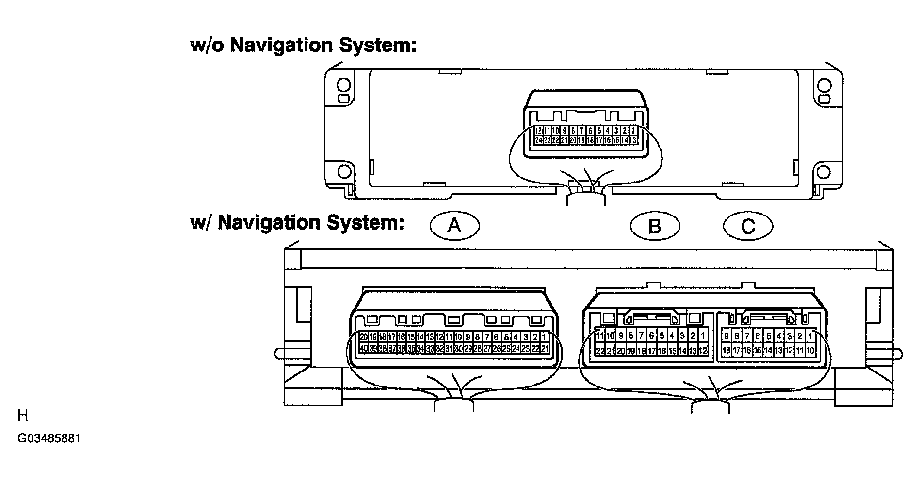 SPECIFIED CONDITION TABLE (W/ NAVIGATION)Tester connection Condition Specified condition B12 (GND) - Ground Constant Continuity B11 (+B) - Ground Constant Battery positive voltage B22 (IG) - Ground ignition switch LOCK or ACC No voltage B22 (IG) - Ground Ignition switch ON Battery positive voltage A10 (RDFGR) - Ground Constant Battery positive voltage w/o Navigation: