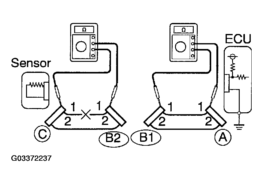 Therefore, it is found out that there is an open circuit between terminal 1 of connector "B2" and terminal 1 of connector "C".
