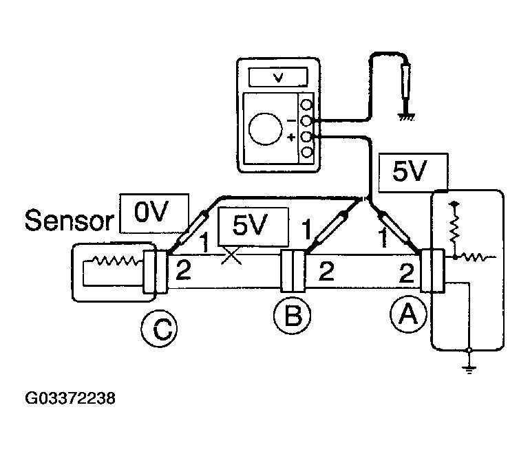 As shown in Fig 9, with each connector still connected, measure the voltage between the body ground and terminal 1 of connector "A" at the ECU 5V output terminal, terminal 1 of connector "B", and terminal 1 of connector "C", in that order.