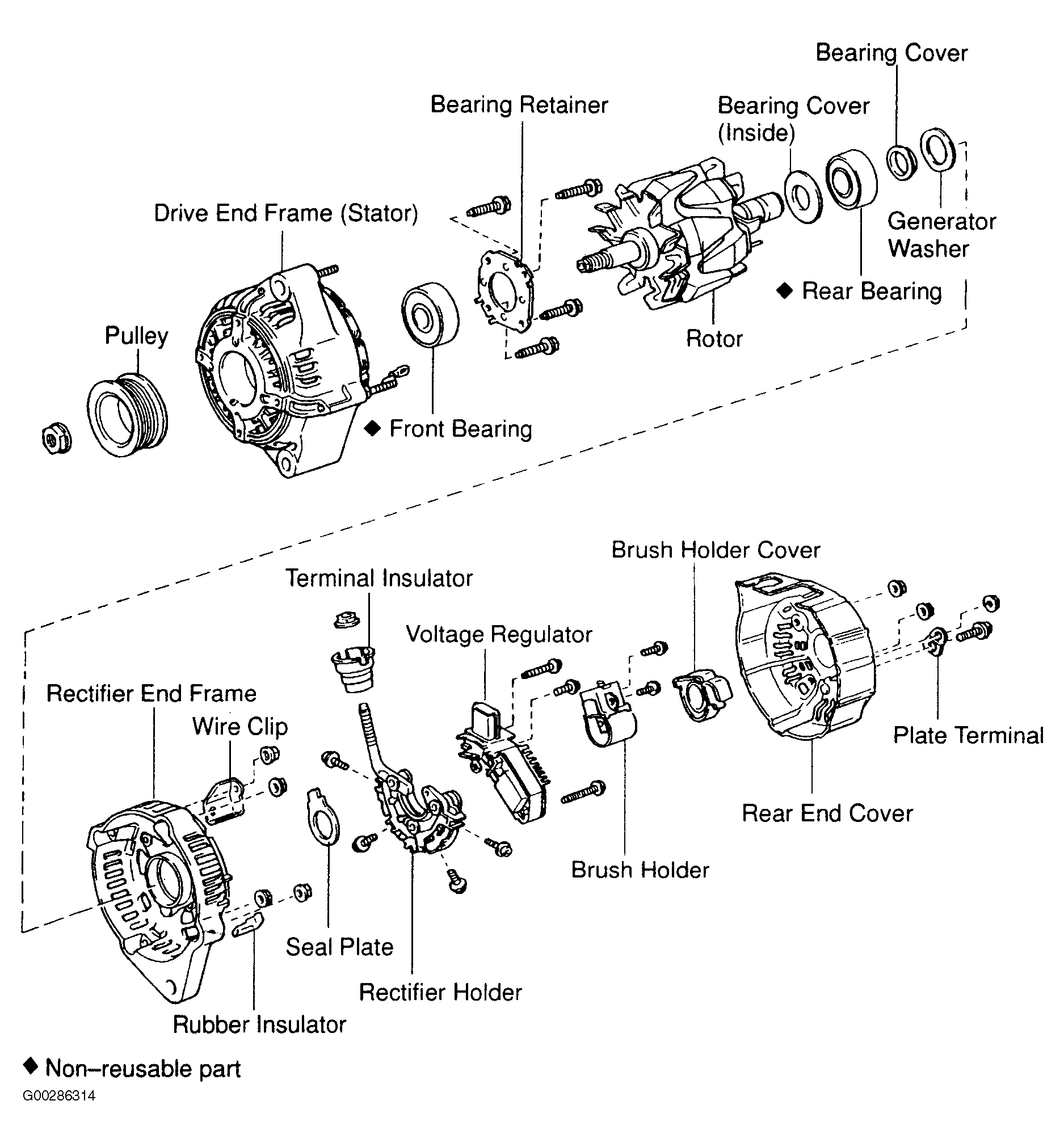 - Remove nut and terminal insulator. Remove plate terminal and rear end cover. See Fig 1. Remove brush holder and voltage regulator. Remove diode (rectifier) holder. Remove rubber insulators. Use generator Pulley Set Nut Wrench Set (SST 09820-63010) to remove generator pulley.