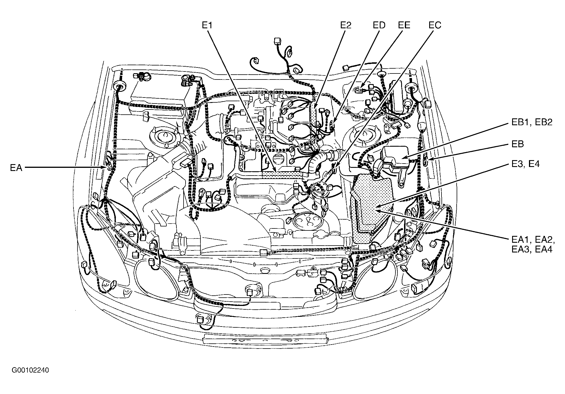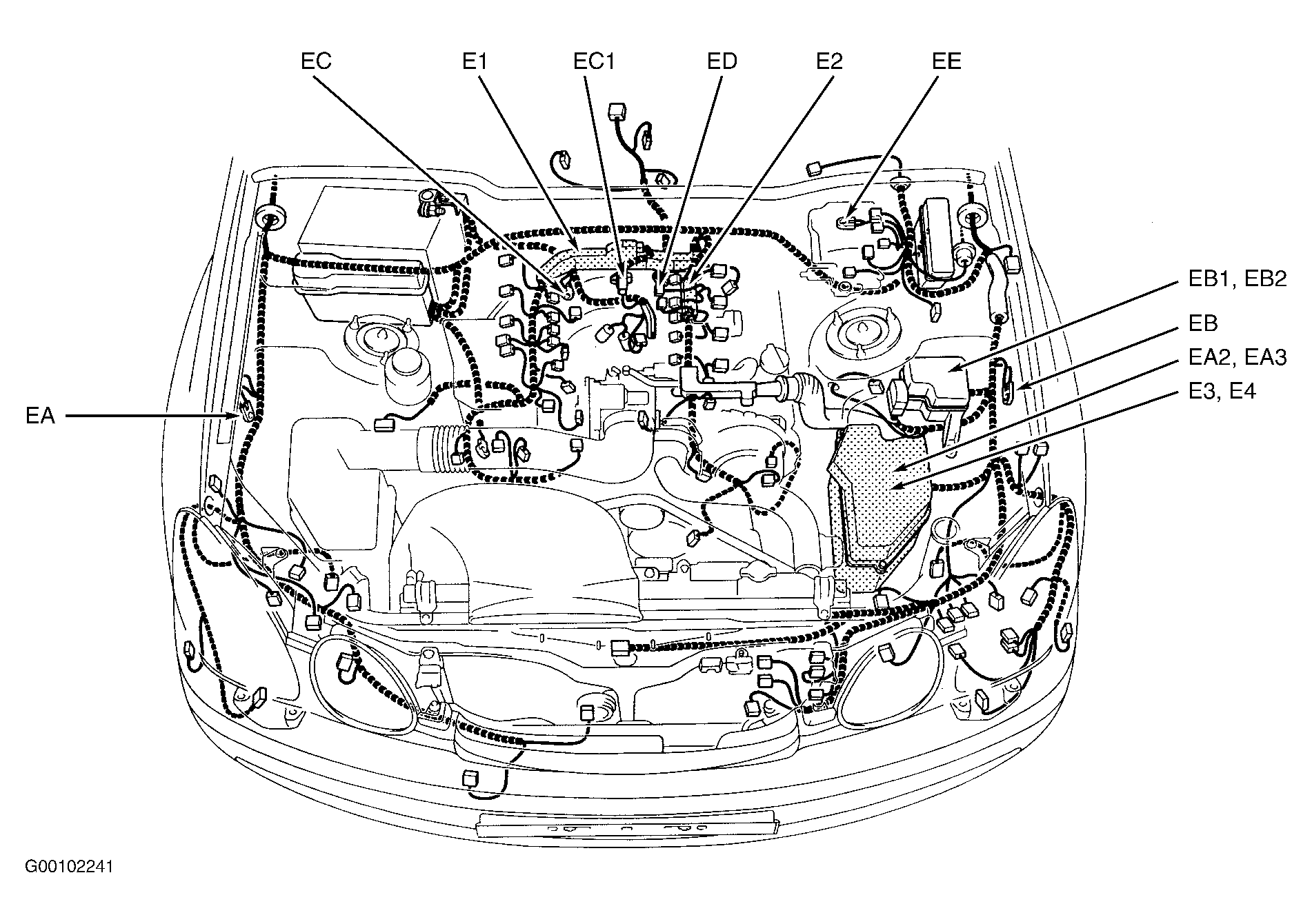 | E2 (3.0L) | In engine harness, at left rear top of engine. See Figure. |