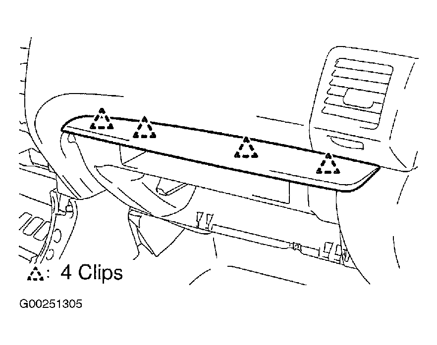 - Remove 5 screws, disengage 2 clips and remove glove compartment door assembly. See Fig 3.