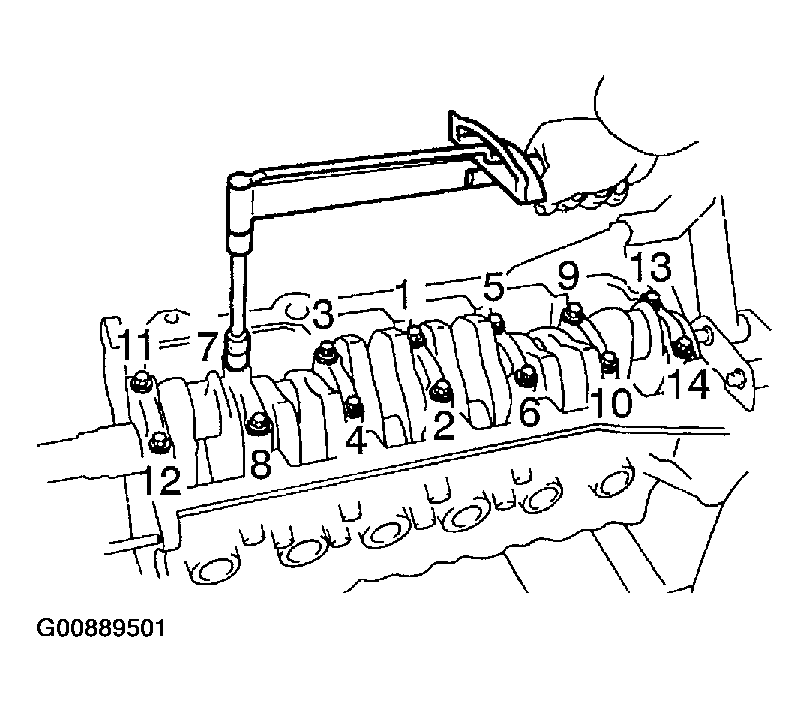 - Retighten the main bearing cap bolts 90° in the numerical order shown in Fig 13.