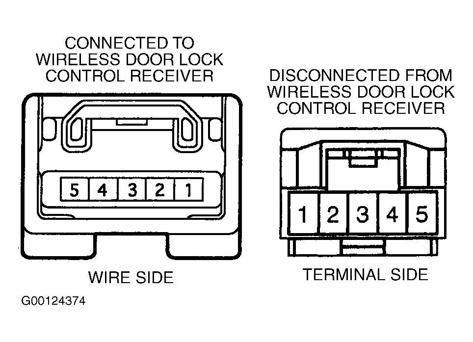 1. Remove wireless door lock control receiver. See WIRELESS DOOR LOCK CONTROL RECEIVER  under REMOVAL & INSTALLATION. Turn ignition off. Disconnect 5-pin electrical harness connector from wireless door lock control receiver.