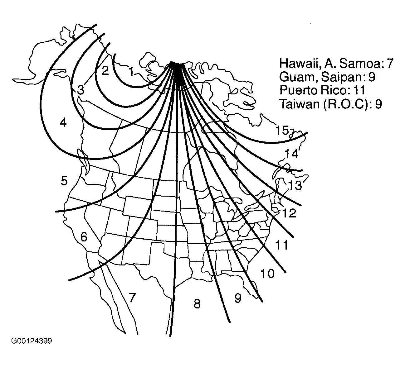Stop vehicle. Push MODE button several times until ZONE XX appears in calendar display area. See Figure. Push RESET/ADJ button to select the zone where vehicle is located by referring to illustration. See Fig 1. After correct zone is entered, push MODE button several times until calendar display returns to normal.