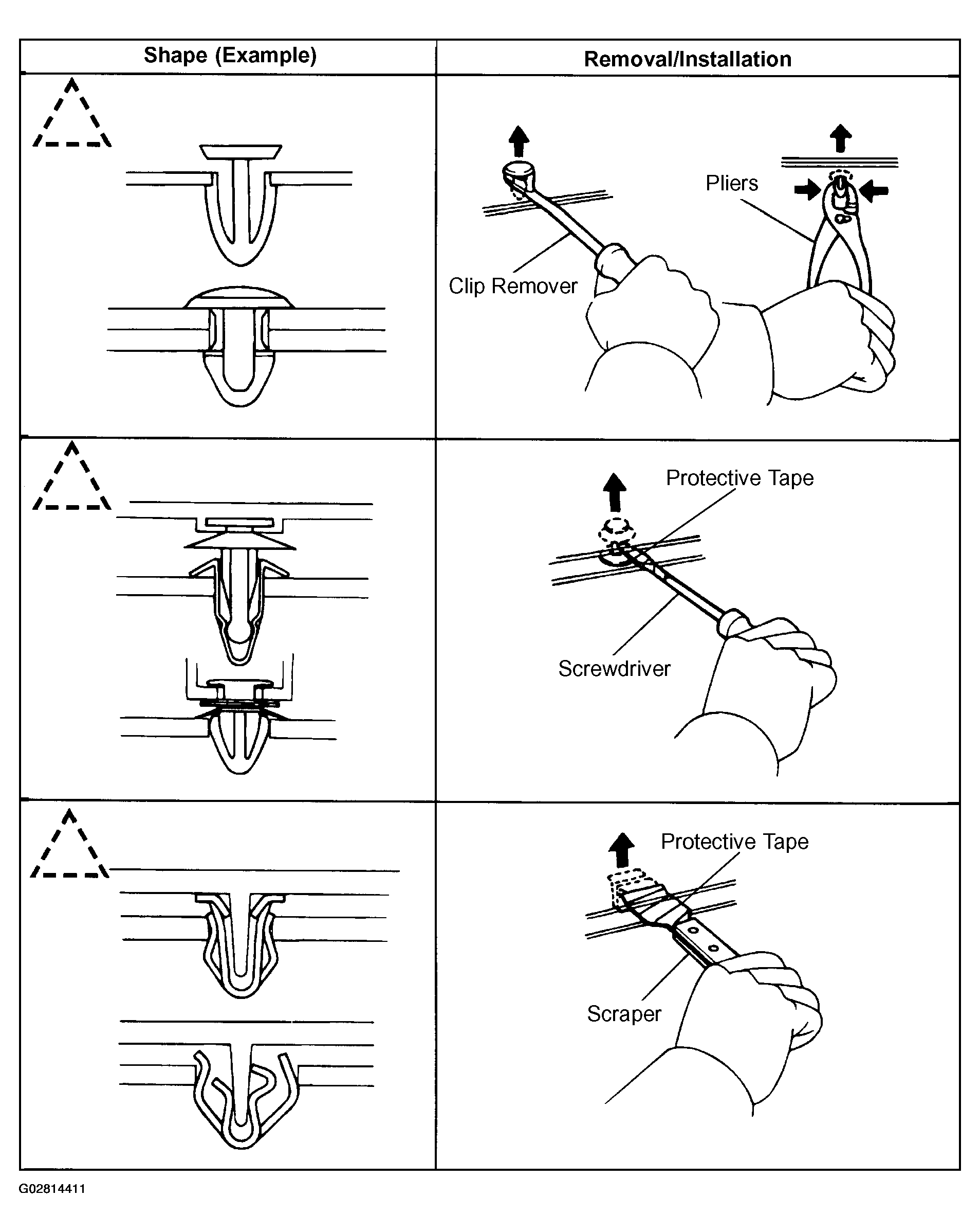 - The removal and installation methods of typical clips used in body parts are shown in Fig 6 and Fig 7.