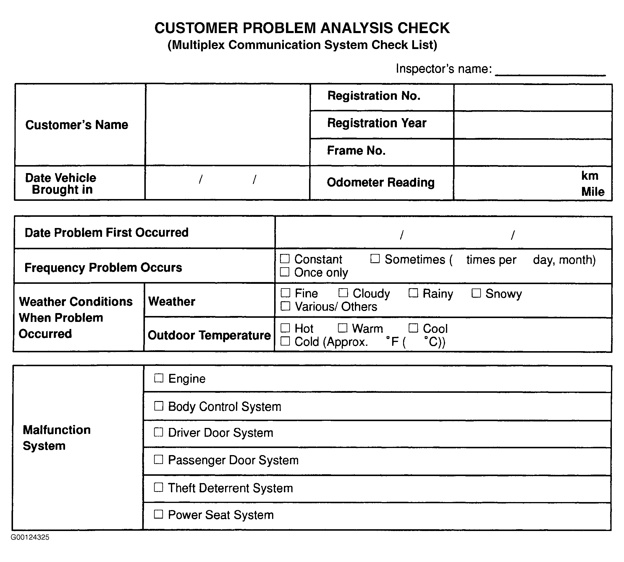 1. Trouble shooting of a multiplex communication system complaint begins with verification of the customer problem. Perform Customer Problem Analysis (Multiplex Communication System Check List). See Fig 1. If problem occurs, go to step  3. If problem does not occur, go to next step.