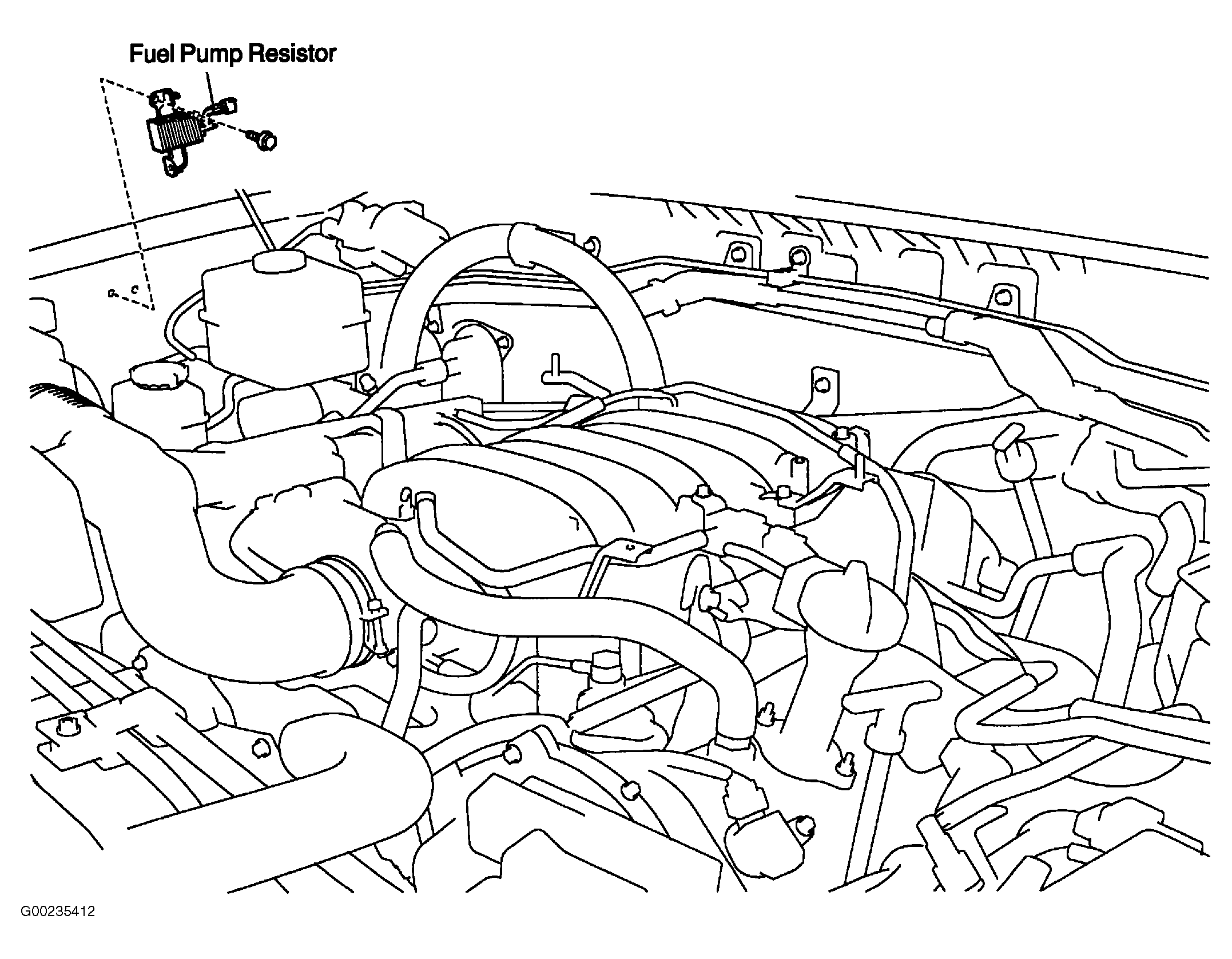 Fuel pump resistor is located on right side of engine compartment. See Fig 1. Remove fuel pump resistor. Using an ohmmeter, measure resistance between terminals. See Fig 2. Resistance should be .70-.76 ohm at 68°F (20°C). Reinstall fuel pump resistor and tighten to 106 inch lbs. (12 N.m.).