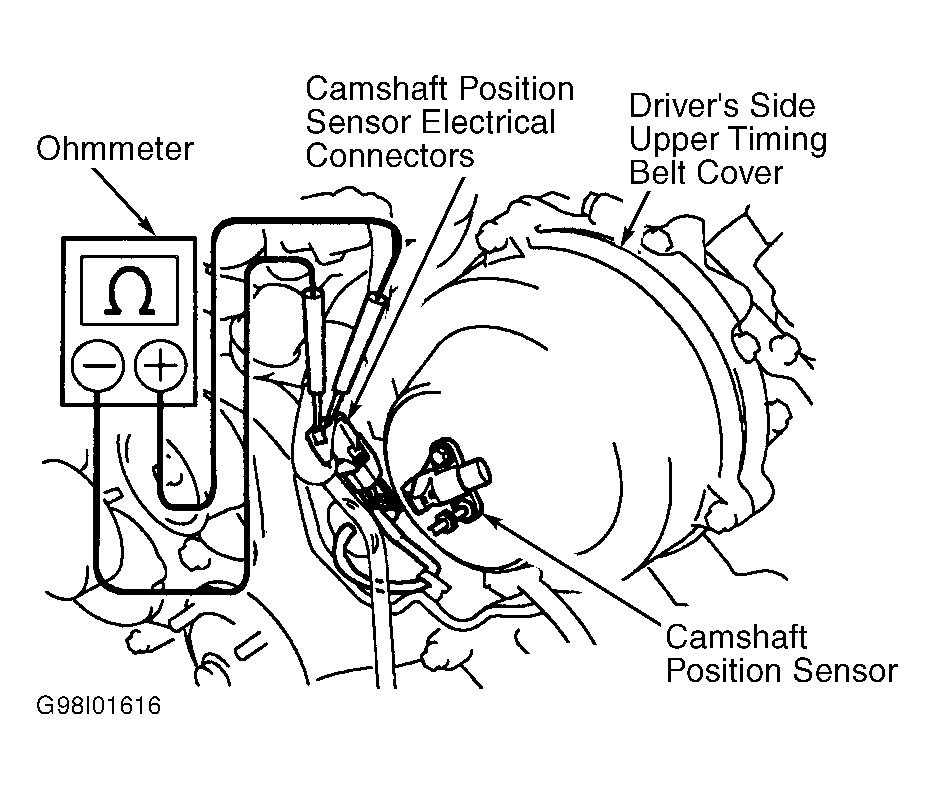 - Using ohmmeter, check resistance between electrical terminals on camshaft position sensor. See Fig 1-Fig 3